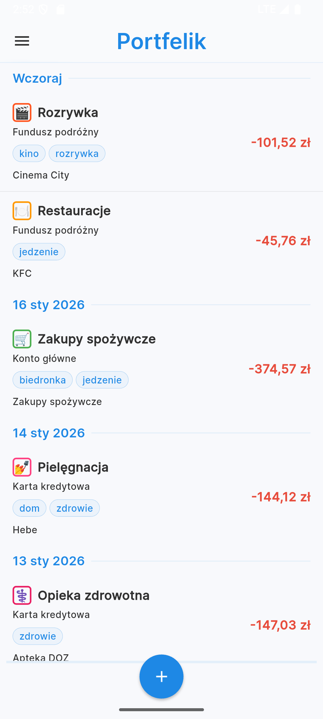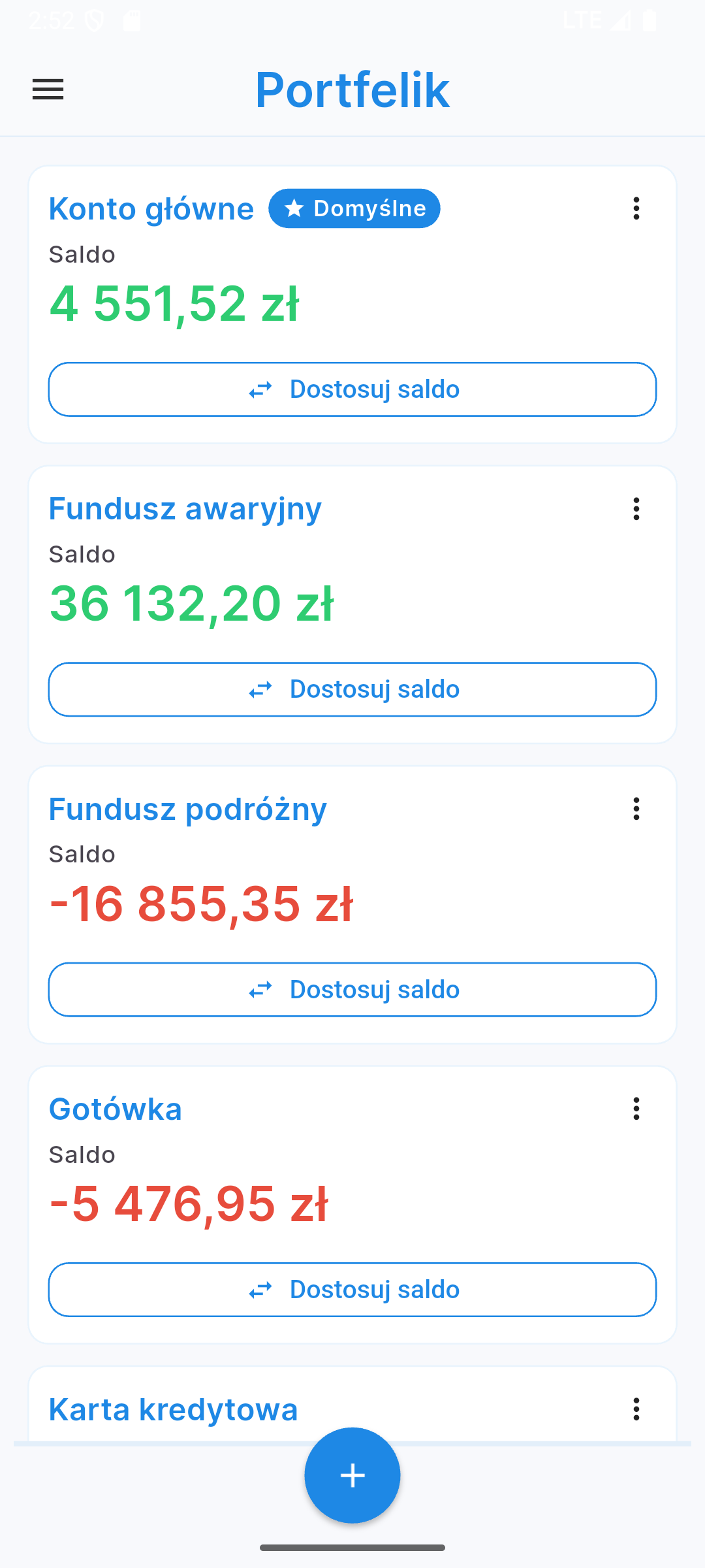 Portfelik pozwala na obsługę wielu kont jednocześnie – od portfela z gotówką, przez konta bankowe, aż po portfele inwestycyjne. W widoku kont zobaczysz listę wszystkich swoich rachunków wraz z ich saldami. Z tego poziomu możesz edytować konta lub dodawać nowe.