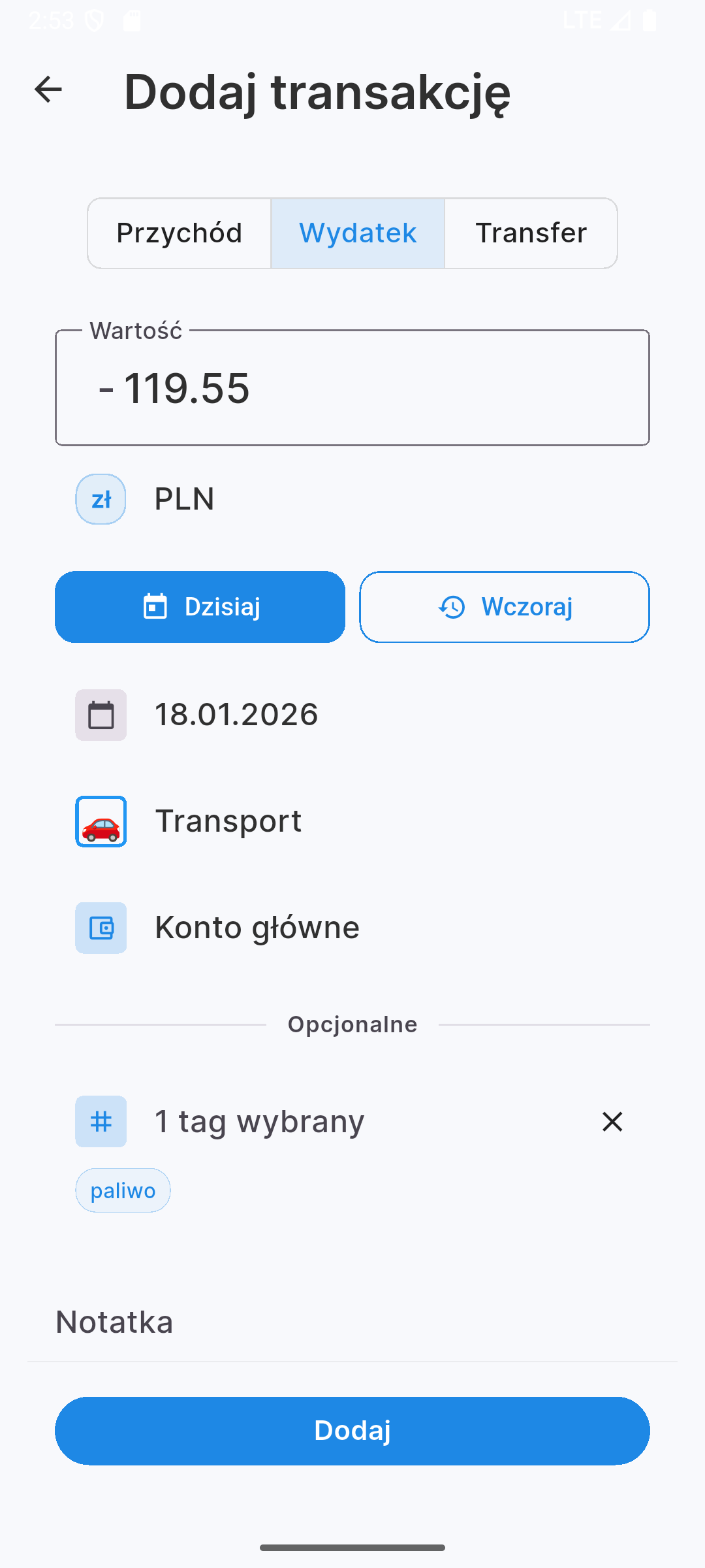 Podczas dodawania nowej transakcji możesz z łatwością określić: