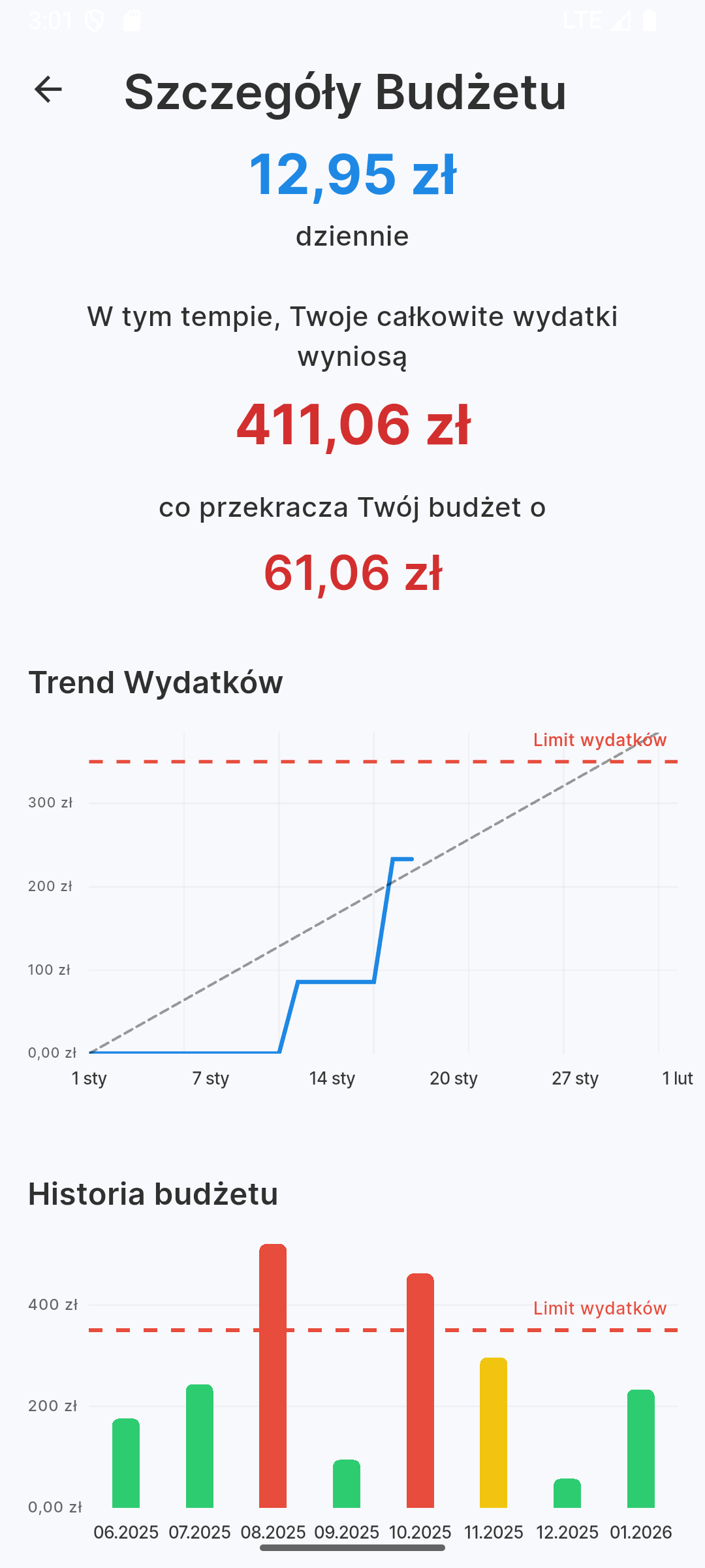 Po wejściu w szczegóły budżetu, Portfelik wyświetli historię oraz predykcję na koniec okresu – dowiesz się, czy przy obecnym tempie wydatków zmieścisz się w założonym limicie na koniec miesiąca, tygodnia lub dnia, w zależności od ustawionego okresu.