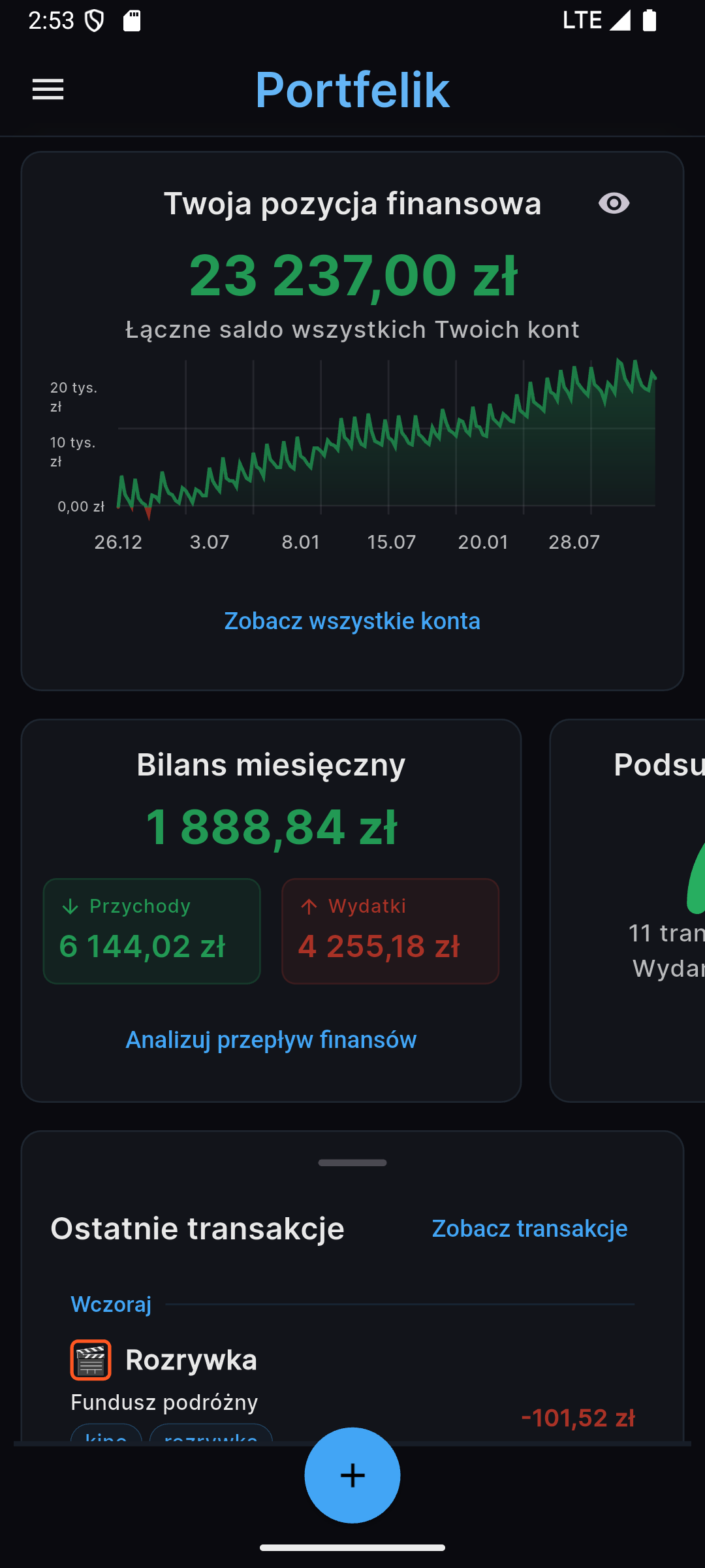 Główny ekran aplikacji pokazuje stan Twojego całkowitego majątku (zsumowane saldo ze wszystkich kont). W trosce o prywatność w miejscach publicznych, dodaliśmy opcję ukrycia tej informacji poprzez naciśnięcie ikonki "oczka".