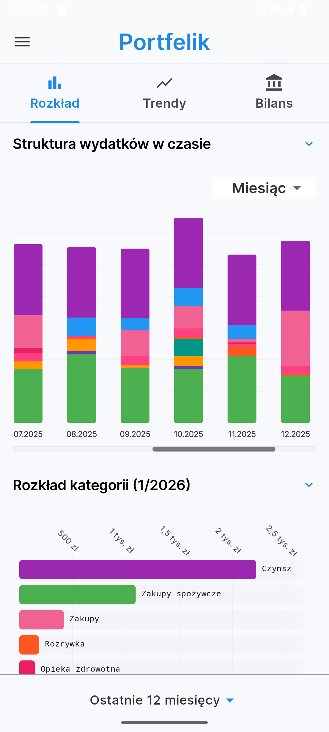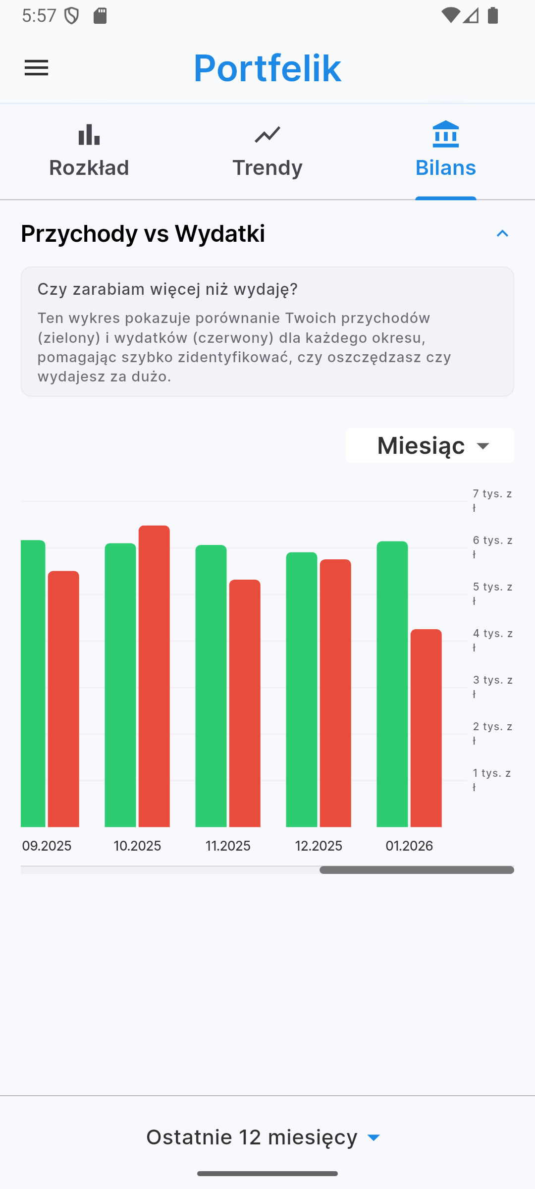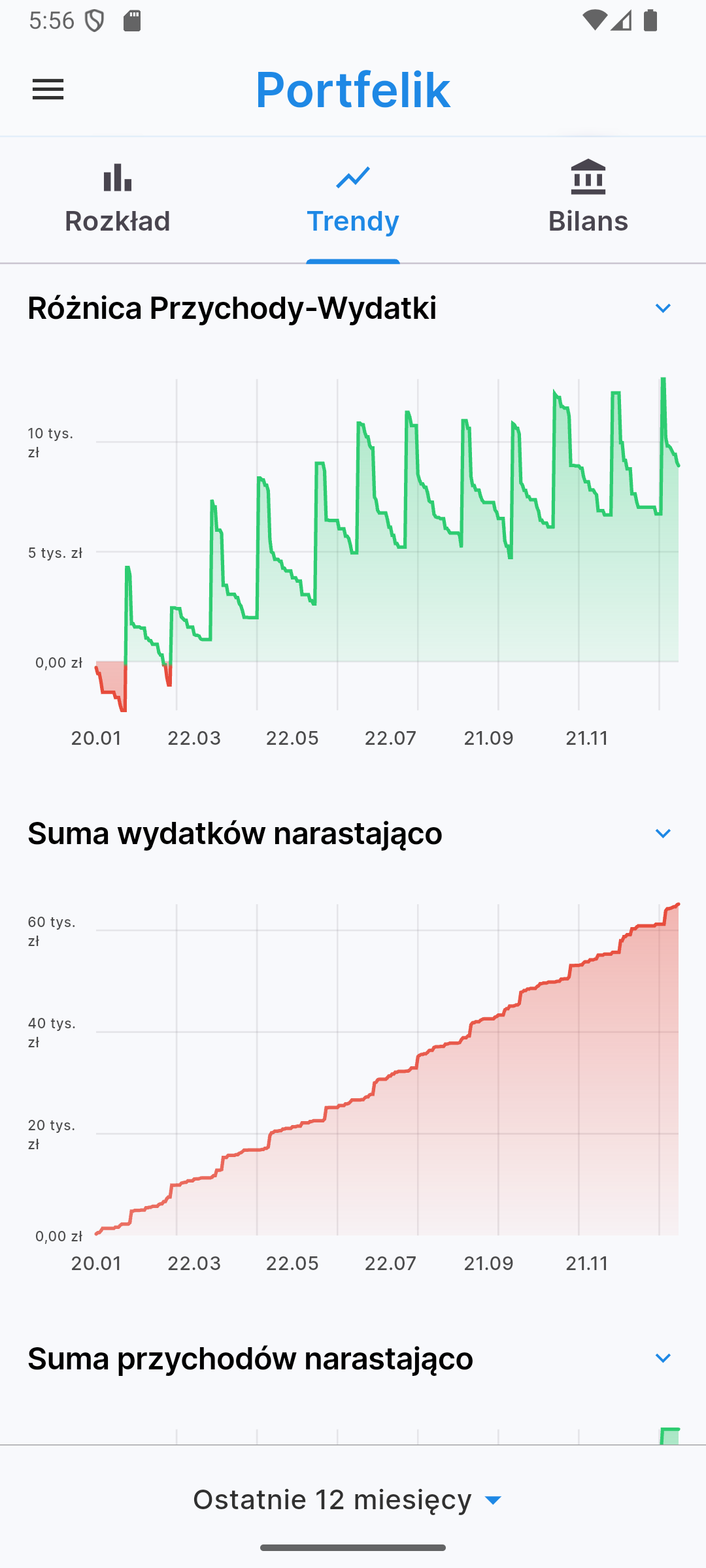 Chcesz wiedzieć, gdzie uciekają Twoje pieniądze? Czy Twój majątek rośnie w czasie? Widok raportów w aplikacji mobilnej oferuje czytelne wykresy słupkowe i liniowe, które pomogą Ci przeanalizować strukturę wydatków według kategorii w wybranym okresie oraz śledzić trendy przychodów i wydatków na przestrzeni czasu.