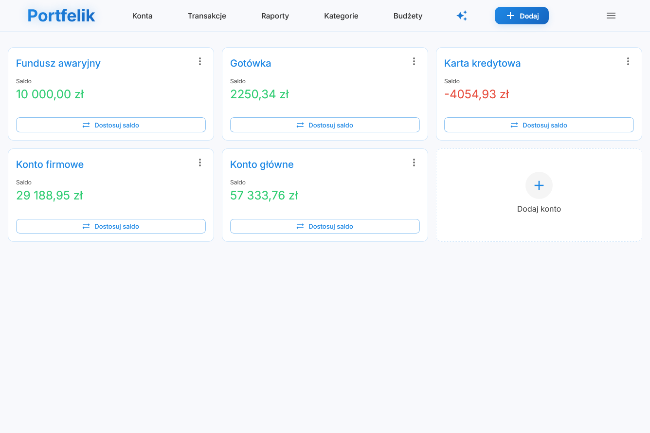 Śledź wszystkie swoje konta w jednym miejscu. Obsługa wielu walut, transfery między kontami i dokładne salda.