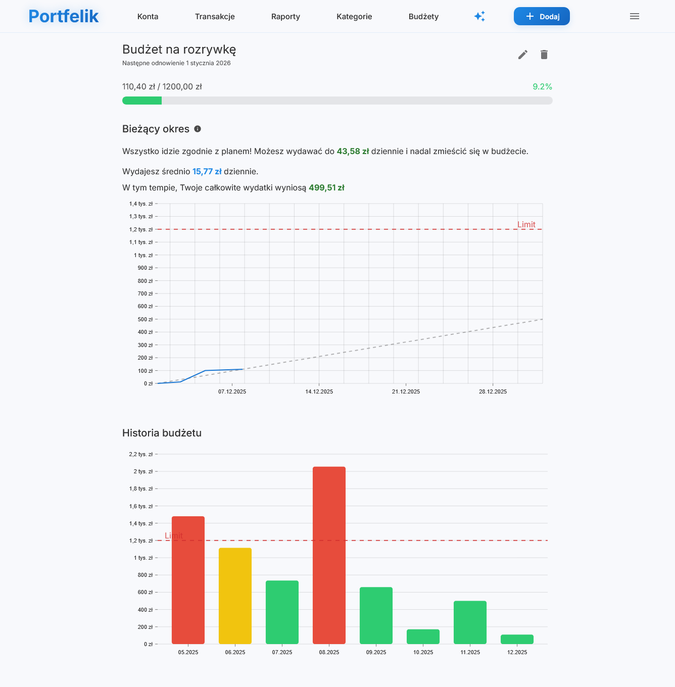 Twórz budżety dla wybranych kategorii. Ustaw limity dzienne, tygodniowe, miesięczne, kwartalne lub roczne i śledź postępy na bieżąco. Portfelik pokaże Ci, ile możesz jeszcze wydać, aby zmieścić się w budżecie.